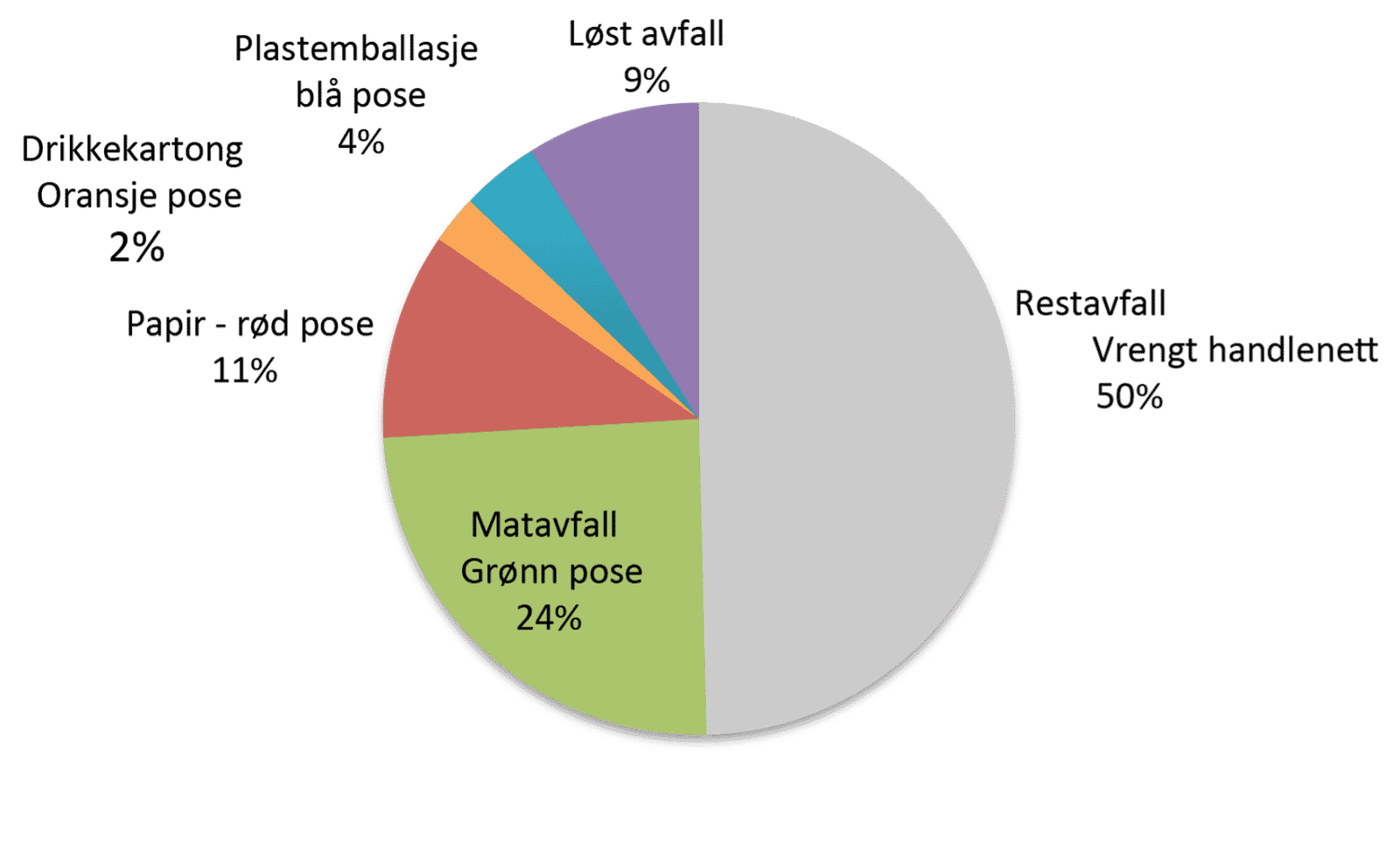 Konklusjon er klar; alt for mye avfall kastes i restavfallet i stedet for i de fargede posene. 67 % av innholdet i restavfallsposene kunne vært sortert ut. Blant annet var nesten 30 % av innhold matavfall.