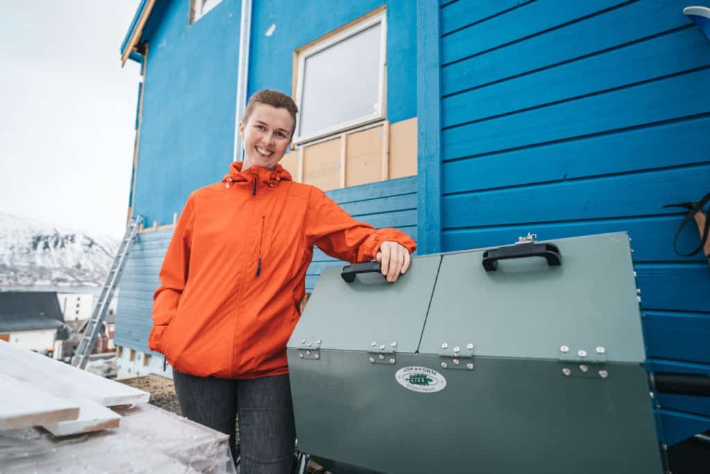 Testfamiliene i prosjektet til Remiks har fått utdelt en varmkompostbeholder. Det betyr at matavfallet holdes helt tett og isolert i en trommel, noe som fører til høy varmeproduksjon og som igjen effektiviserer komposteringsprosessen.