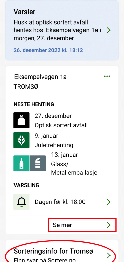Se mer > gir deg en oversikt over alle kommende tømmekalender og varslingsinnstillinger.