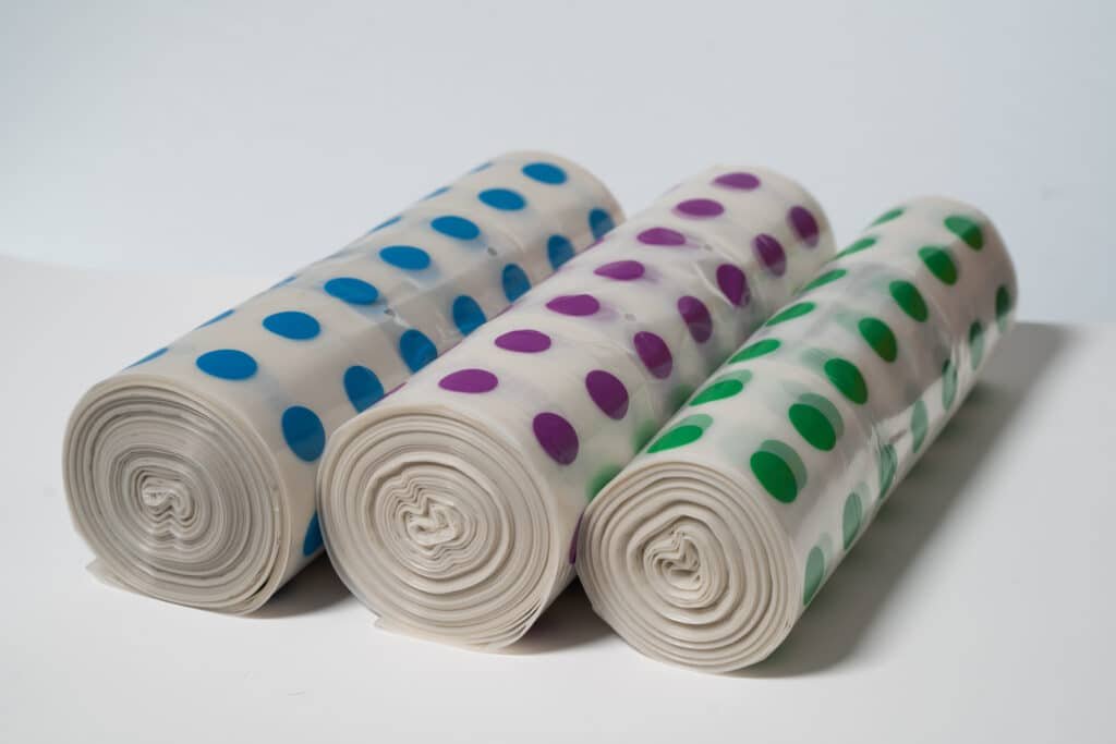 Tromsøstudentene er knallgode til å sortere i prikkede poser. blå poser inneholder stort sett bare papp, papir og kartong, lilla prikkede poser plastemballasje, og grønne prikkede poser stort sett matavfall.